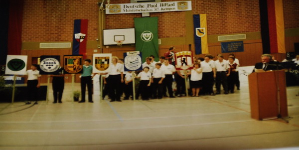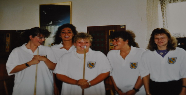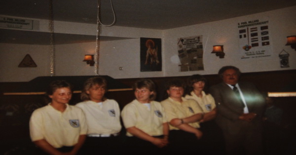 Helga belegte den 4.Platz im 14/1 e..Ein großer Erfolg für den Verein und der Stadt Kempen Claudia Martens hatte sich für die Deutsche Jugendmeisterschaft in Pirmasens qualifiziert und belegte einen 7.Platz. Abstieg der 1.Mannschaft aus der Oberliga, Stadt und Kreismeistertitel konnten jedoch erspielt werden. Sie belegten den 2. Platz. Ostern spielten wir beim Osterturnier der Schwarzen 8 Berlin mit, und sehr erfolgreich. Die 1.Mannschaft belegte in der Verbandsliga Platz 2 und stieg wieder in die Oberliga auf. Friedhelm Fiekers wurde in die PBVN Auswahl berufen und spielte gegen den Rhein Ruhr Verband mit. |