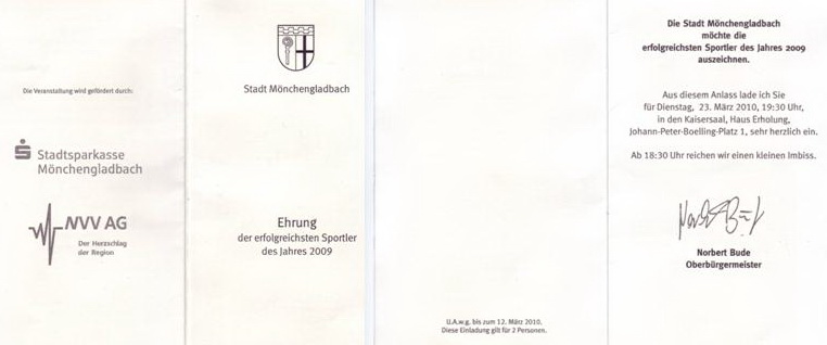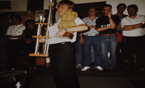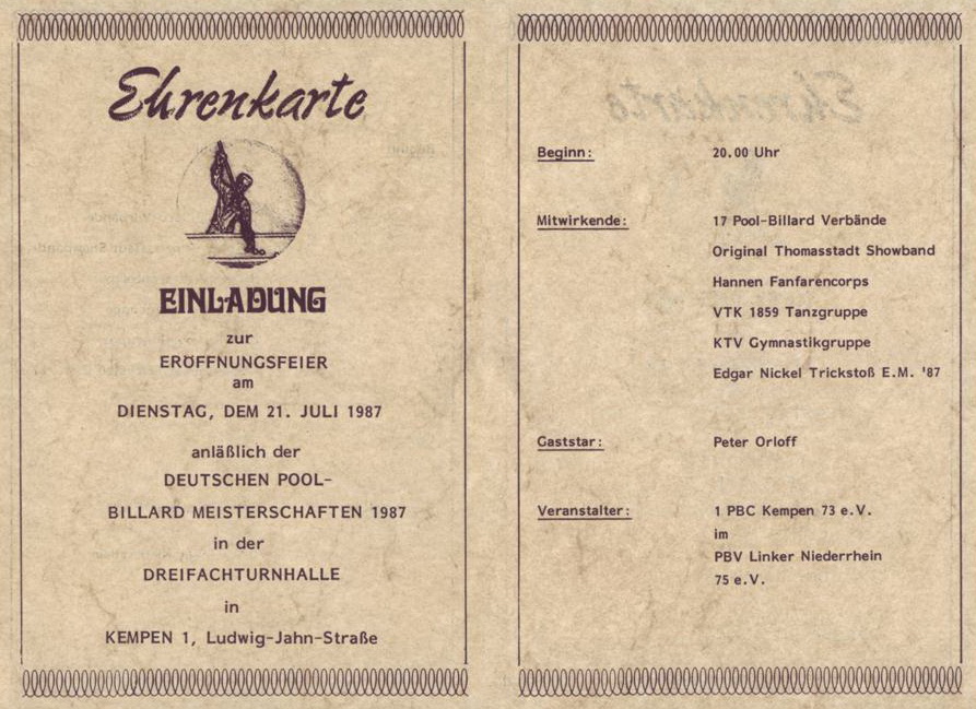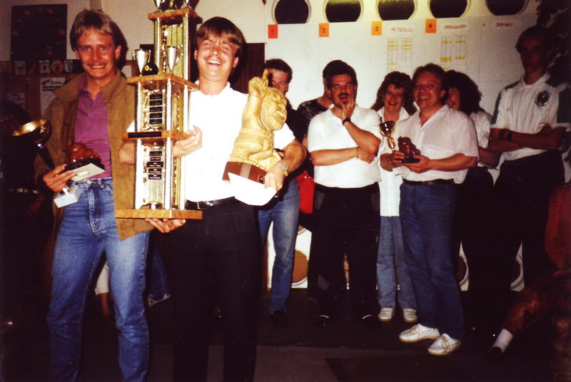 Bei der Ehrung der Stadt Kempen der erfolgreichsten Sportler 1989 wurden auch Sportler des 1 PBC Kempen geehrt. Das goldene Sportabzeichen erhielt für die Erinnerung des Deutschen Meistertitels 1988 Damen Mannschaft, Sylvia Büchhüter Claudia und Sabine Martens. Für die Vize Europameisterschaft der Damen 14/1e wurde Sylvia Buchhüter ebenfalls geehrt. Das 4er Mannschaftsturnier vom 1 PBC Leverkusen ausgerichtet gewann die Mannschaft v. 1 PBC Kempen mit Thomas Peters, Andreas Kehder, Ingo Schweden und Norbert Fischer, man konnte den 1.Preis 400,00 DM in Empfang nehmen. |