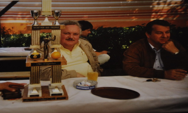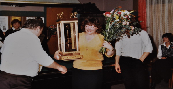 Helga Martens erhält von Hans Stern, Geschäftsführer des Pool Verbands von Österreich den Pokal und Ehrenpreis von Klagenfurth Deutsche Meisterschaft in Wanheimerort-Duisburg. Für den Verein nahm nur Birgit Martens in der Disziplin 8 Ball als TV teil und belegte den 2.Platz. Als Deutsche Vizemeisterin kam Sie nach Hause. |