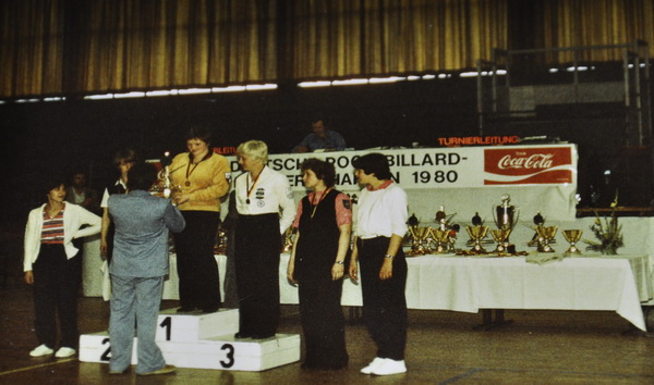 Deutsche Meisterschaft 1980 Austragungsort Berlin Verbandsmeisterschaft des PBVN 14/1e 1.Platz Helga Martens DRE 1.Platz Birgit Martens DRE 3.Platz Helga Martens waren für die DM in Berlin 1980 qualifiziert. Die zum ersten Mal in Berlin ausgetragene Deutsche Damen Meisterschaft wurden für unsere beiden Damen zum größten Erfolg Ihres Poolspiels. Birgit wurde Deutsche Meisterin im DRE.