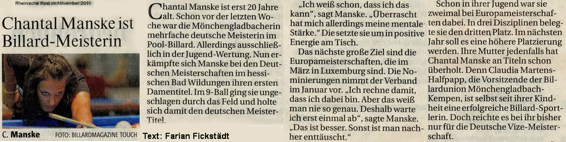 Europameisterschaft Jugend vom 30.07.2011 bis 07.08.2011 "im Alvisse Parc Hotel Luxemburg" 1. Platz Chantal Manske Billardunion Mönchengladbach-Kempen 1969/03 e.V. Landesmeisterschaft Damen Kader 8 Ball Einzel 11.09.2011 "in Krefeld" Chantal Manske und Tobias Bongers von der Billardunion Mönchengladbach-Kempen 1969/03 e.V. haben dazu beigetragen. Der Billard-Verband Niederrhein hat den diesjährigen Alois-Metzinger-Cup 2011 gewonnen. 1. Platz