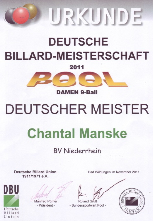 1. Platz Adriana Manske Billardunion Mönchengladbach-Kempen 1969/03 e.V. Landesmeisterschaft Jugend weiblich B-Kader 10 Ball Einzel 20.11.2011 " in Geldern " 1. Platz