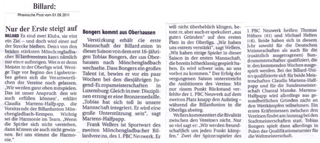 Die Billard Union Mönchengladbach - Kempen 1969/ 03 e.V. startet in die neue Saison mit: 1 Bundesliga Mannschaft, 2 Oberliga Mannschaften, 1 Verbandsliga, 2 Landesliga Mannschaften, 1 Jugend Mannschaft, 1 Damen Mannschaft, 2 Senioren Mannschaften, 6 Pokal Mannschaften, 4 9 Ball Cup Mannschaften, 1 Snooker Mannschaft, Wir hoffen auf ein gutes abschneiden und dass keine Mannschaft absteigen muss, und sich die Damen- und Jugend Mannschaft für die Deutsche Meisterschaft qualifizieren. Das gleiche wünschen wir den Pokal- und Senioren Mannschaften, so wie gute Einzel Platzierungen die zur Teilnahme an den Deutschen Meisterschaften berechtigen. Damen 1. Platz 8 Ball Chantal, Manske, 1. Platz9 Ball Chantal, Manske, 1. Platz Pok.E. Chantal, Manske, 2. Platz Pok.E Claudia, Martens-Manske Senioren 1. Platz 8 Ball Roland, Burghoff, 1. Platz9 Ball Rainer, Jussen, 3. Platz Pok.E. Rainer, Jussen, 1. Platz14/1 Rainer, Jussen Herren 1. Platz 8 Ball Micca, Georgopulos, 2. Platz8 Ball Thomas, Hölters, 3. Platz8 Ball Sascha, Jülichmanns, 4. Platz8 Ball Frank, Strerath, 1. Platz9 Ball Udo, Meyer, 2. Platz9 Ball Sascha, Jülichmanns, 1. Platz Pok.E. Micca, Georgopulos, 2. Platz Pok.E. Frank, Strerath, 3. Platz Pok.E. Sascha, Jülichmanns, 4. Platz Pok.E. Boris, Creischer, 1. Platz14/1 Frank, Strerath, 2. Platz14/1 Boris, Creischer |