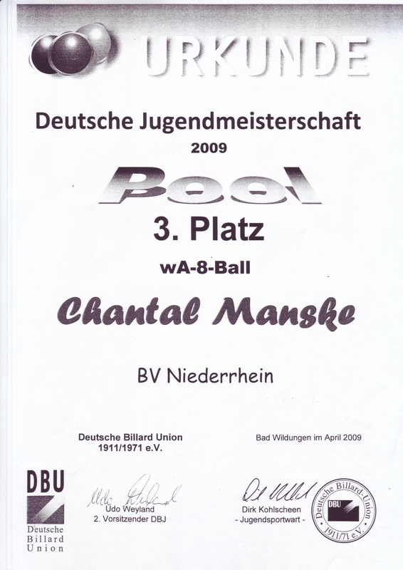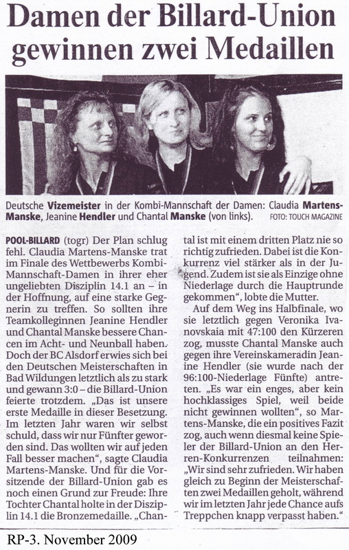 01.11.2008 bis 09.11.2008 2008 Deutsche Billard-Meisterschaften im Einzel und Mannschaft Unsere Damenmannschaft belegte den 5. Platz Ladies Martens-Manske, Claudia BU M´gladbach/Kempen 69/03 e.V. 13.Platz im 8-Ball Martens-Manske, Claudia BU M´gladbach/Kempen 69/03 e.V. 5.Platz im 9-Ball Damen Manske, Chantal BU M´gladbach/Kempen 69/03 e.V. 9.Platz im 8-Ball Pokal Manske, Chantal BU M´gladbach/Kempen 69/03 e.V. 13.Platz im 14/1e Manske, Chantal BU M´gladbach/Kempen 69/03 e.V. 13.Platz im 8-Ball Manske, Chantal BU M´gladbach/Kempen 69/03 e.V. 5.Platz im 9-Ball Hendler, Jeaninne BU M´gladbach/Kempen 69/03 e.V. 5.Platz im 9-Ball Senioren Helten, Michael BU M´gladbach/Kempen 69/03 e.V. 5.Platzt im 8-Ball Pokal Helten, Michael BU M´gladbach/Kempen 69/03 e.V. 17.Platz im 14/1e Helten, Michael BU M´gladbach/Kempen 69/03 e.V. 25.Platz im 8-Ball Herren Hölters, Thomas BU M´gladbach/Kempen 69/03 e.V. 17.Platz im 8-Ball Pokal Halfpapp, Alexander BU M´gladbach/Kempen 69/03 e.V. 17.Platz im 8-Ball Pokal Hölters, Thomas BU M´gladbach/Kempen 69/03 e.V. 25.Platz im 8-Ball