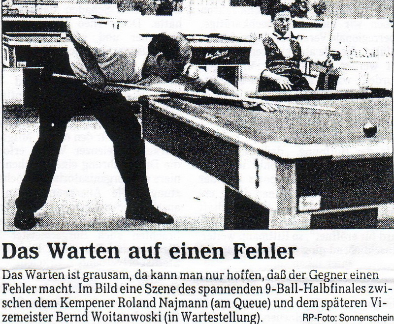 Platz 5 im 9er Ball ging an Roland Najmann, In der Mannschaft spielten; Ralf Mund, Roland Najmann, Andreas Kehder und Dieter Frambach. Das Finale wurde mit 9:5 gegen Olympia München gewonnen. |