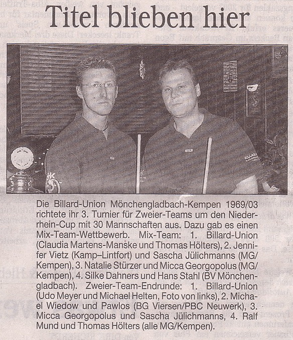 Heinz, Martens Hans, Kirchhoff Claudia, Martens - Manske kom. Helga, Martens Der Verein nimmt mit: 5 Kombi Mannschaften, 1 Senioren Mannschaft, 1 Damen Mannschaft, 1 Jugend Mannschaft am Spielbetrieb des Pool Billard Verband Niederrhein ( PBVN ) und des Billard-Verband Niederrhein ( BVNR ) teil Aufteilung in Ligen Oberliga BVNR Mannschaft 1 + 2, Verbandsliga PBVN Mannschaft 3, Landesliga PBVN Mannschaft 4 + 5 Damen, Senioren und Jugendmannschaften Spielen im PBVN mit Qualifikation Zur Oberliga im BVNR mit dortiger Qualifikation zur Deutschen Meisterschaft Verbandsliga PBVN Damen Mannschaft, Jugend Mannschaft, Senioren Mannschaft, Pokal Mannschaft Die recht junge Billardunion kann bereits auf folgende Erfolge zurückblicken. Verbandsmeisterschaften ( PBVN ) Jugend: 1. Platz 8-Ball Sascha, Jülichmanns, 1. Platz 9-Ball Sascha, Jülichmanns, 1. Platz 14/1 Sascha, Jülichmanns Landesmeisterschaft. BVNR Jugend 1. Platz 8-Ball Sascha, Jülichmanns, 1. Platz 9-Ball Sascha, Jülichmanns, 1. Platz 14/1 Sascha, Jülichmanns Deutsche Jugendmeisterschaft in Bruchsal, 13. Platz 14/1 Sascha, Jülichmanns, 9. Platz 9-Ball Sascha, Jülichmanns Zum 1. Mal nahm Chantal Manske an der Jugend DM in Bruchsal teil, und konnte sich als 11 jährige in der B Jugend nicht behaupten, sie platzierte sich im unteren Mittelfeld. 2003 Verbandsmeisterschaft PBVN Herren 1. Platz Pokal Thomas, Hölters, 2. Platz 9-Ball Thomas, Hölters, 2. Platz 8-Ball Thomas, Hölters, 2. Platz 14/1 Thomas, Hölters, 3. Platz 8-Ball Frank, Strerath, 3. Platz 14/1 Frank, Strerath Damen 1. Platz 8-Ball Natali, Stürtzer, 1. Platz 9-Ball Natali, Stürtzer, 2. Platz 14/1Natali, Stürtzer, 3. Platz 14/1 Claudia, Martens-Manske Senioren 3. Platz 9-Ball Rainer, Jussen, Senioren 50 plus 1. Platz Kombi Hans, Kirchhoff, 3. Platz Kombi Heinz, Martens 1. Platz Damen Mannschaft, 3. Platz Jugend Mannschaft, 3. Platz Senioren Mannschaft, 2. Platz Super Cup 1. Mannschaft 3. Platz Super Cup 2. Mannschaft, 1. Platz 9 Ball Cup 1. Mannschaft, 2. Platz 9 Ball Cup 2. Mannschaft Landesmeisterschaft BVNR Damen 1. Platz 14/1 Natali, Stürtzer, 1. Platz9-Ball Natali, Stürtzer, 3. Platz Pokal Natali, Stürtzer, 1. Platz Pokal Claudia, Martens-Manske, 2. Platz8-Ball Claudia, Martens-Manske, 3. Platz14/1 Claudia, Martens-Manske Herren 2. Platz8-Ball Frank, Strerath, 3. Platz14/1 Thomas, Hölters, 3. Platz Pokal Thomas, Hölters Senioren 3. Platz9-Ball Rainer, Jussen Landesmeisterschaft - Oberliga 3. Platz1. Mannschaft, 5. Platz2. Mannschaft, 1. Platz Damen 1. Mannschaft, 3. Platz Pokal 1. Mannschaft Die Damenmannschaft qualifizierte sich für die Teilnahme an der Deutschen Meisterschaft Deutsche Meisterschaft in Brandenburg 9. Platz Damen 1. Mannschaft, 9. Platz Pokal Claudia, Martens-Manske, 5. Platz9-Ball Natali, Stürtzer |